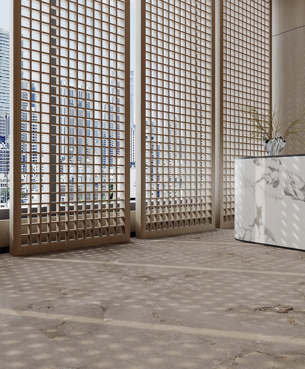 沉穩(wěn)的一深一淺灰調(diào)融合像是自然的冰川留痕,瓷磚表面靈動線條宛若激流穿梭于峽谷山澗,生動還原山與水的碰撞,讓空間舒展且充滿活力。