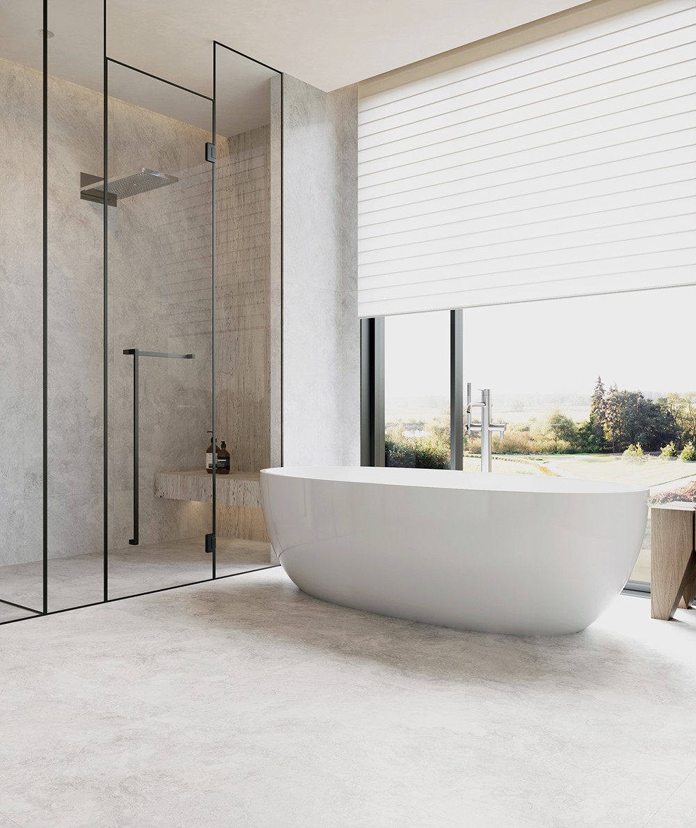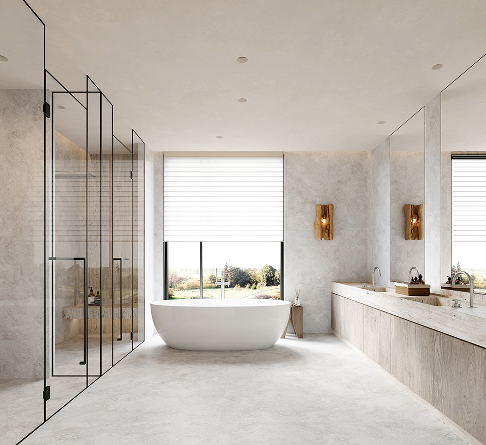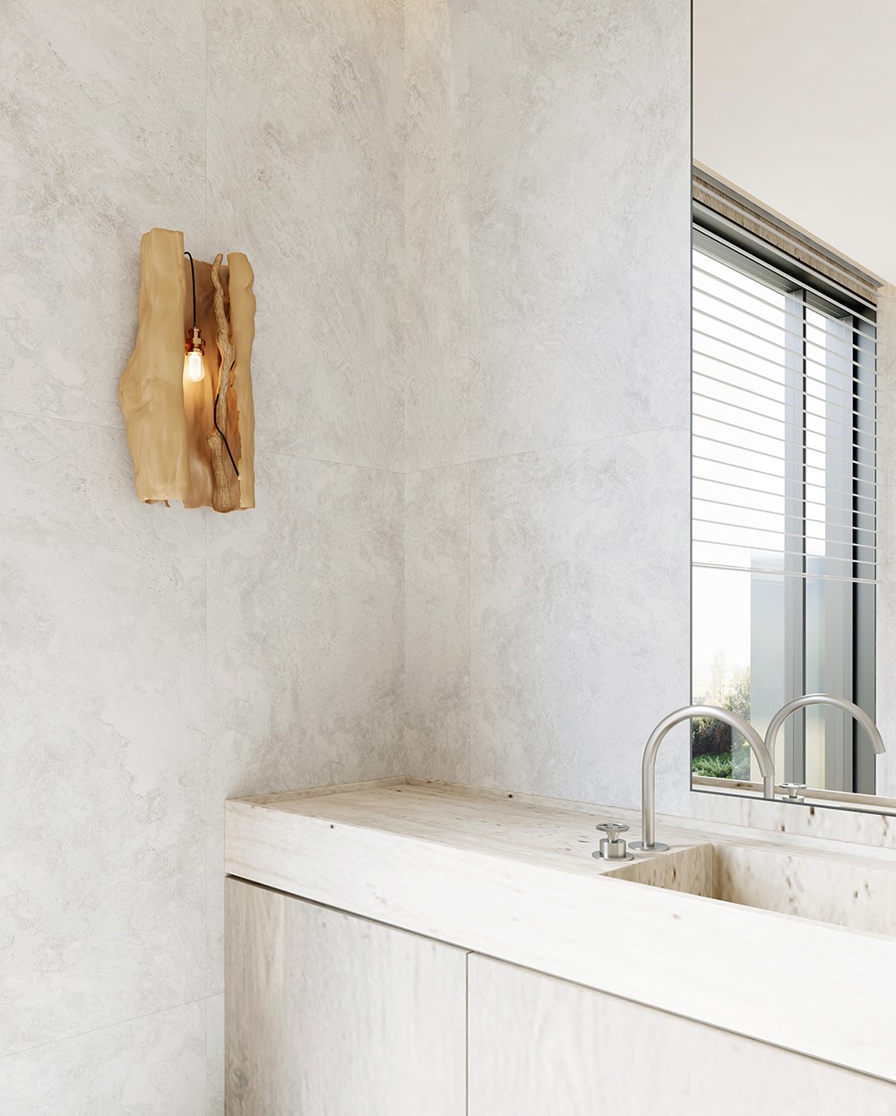 以白灰色為主調,細膩再現了天然洞石標志性的自然孔洞與條紋,仿佛歲月沉淀下的溫柔印記。保留石材原有質樸感的同時賦予其純凈而不失溫暖的美感。