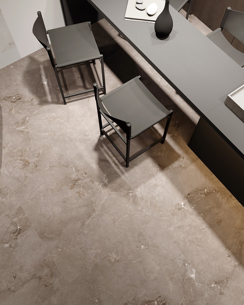 沉穩的一深一淺灰調融合像是自然的冰川留痕,瓷磚表面靈動線條宛若激流穿梭于峽谷山澗,生動還原山與水的碰撞,讓空間舒展且充滿活力。