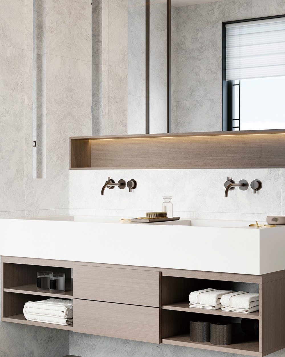 以白灰色為主調,細膩再現了天然洞石標志性的自然孔洞與條紋,仿佛歲月沉淀下的溫柔印記。保留石材原有質樸感的同時賦予其純凈而不失溫暖的美感。
