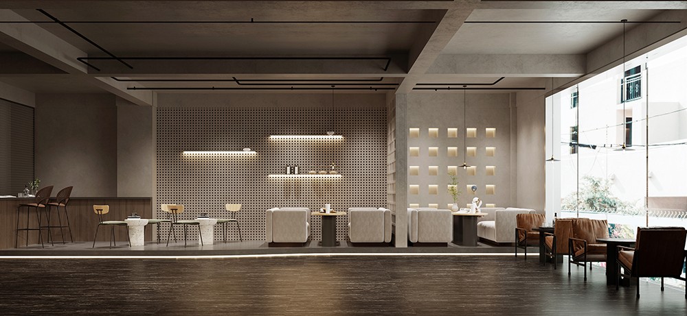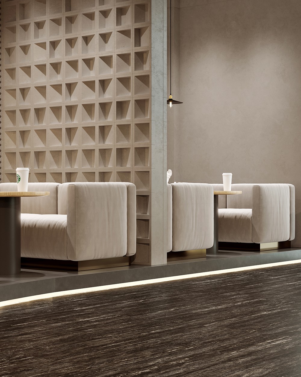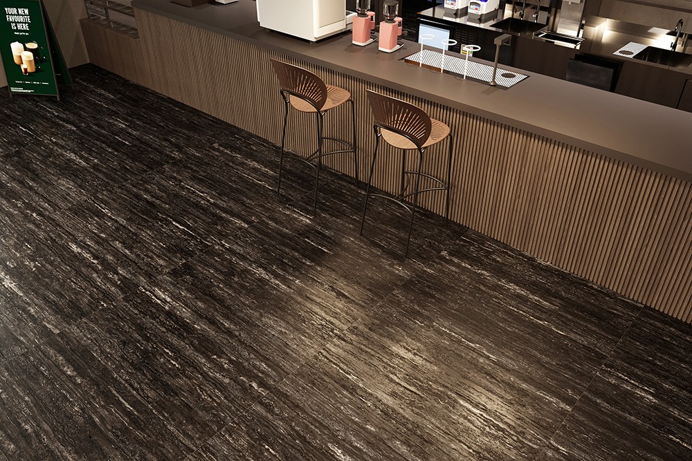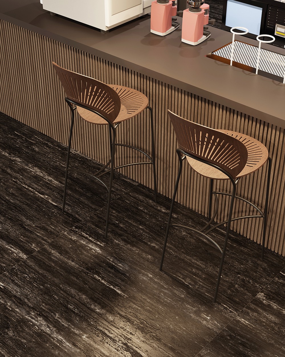 炭灰底面勾勒銳利洞石脈絡(luò),深邃孔隙與冷峻線條并置,呈現(xiàn)現(xiàn)代工業(yè)美學(xué)下的自然張力。